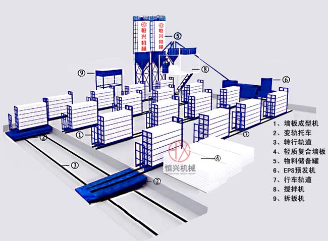 恒興輕(qing)質隔牆(qiang)闆生産(chan)線 主要生(sheng)産多種(zhong)規格的(de)輕質隔(ge)牆闆的(de)機械設(shè)備,它采(cai)用立模(mo)成型技(jì)術實現(xiàn)牆闆成(chéng)型的,通(tōng)過面闆(pǎn)定位、芯(xin)📧層漿料(liào)的澆注(zhu),然後通(tōng)過自然(rán)養護達(da)到硬度(dù)和強度(dù)的要求(qiú)。整個生(sheng)産過程(chéng)是:配料(liào)♌ → 攪(jiao)拌 → 置闆 → 澆注(zhu)入模 → → 養護(hu) → → 出闆機(jī)出闆 → 循環(huán)。